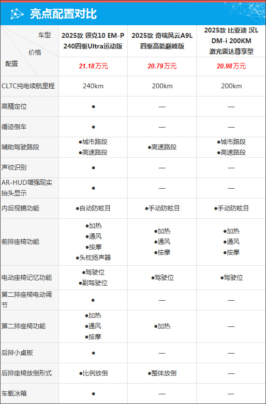 价格方面,风云A9L的起售价最低,而顶配车型价格最贵的是汉L DM。车型数量上,领克10 EM-P和风云A9L均提供了4款,汉L DM为3款。