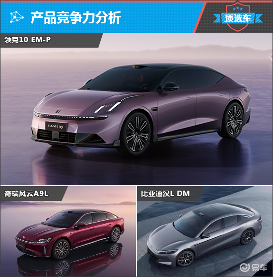 此次与2025款领克10 EM-P(下文简称领克10 EM-P)对比的车型分别为2025款奇瑞风云A9L(下文简称风云A9L)和2025款比亚迪汉L DM(下文简称汉L DM)。三款车型中,领克10 EM-P和汉L DM的车身长度相同,携手领先,不过车身宽度和轴距是领克10 EM-P更胜一筹。