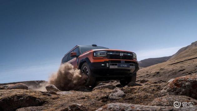 外观设计上,两款车精准诠释了不同的硬派美学。捷途纵横G700以纵横美学为主题,采用“方盒子”造型设计,大尺寸熏黑进气格栅镶嵌品牌标识,方形矩阵式大灯搭配硬派前包围套件,尽显复古越野韵味。车身侧面的粗犷轮眉与熏黑侧裙强化肌肉感,车尾侧开式尾门与外挂备胎包延续硬派基因,野性十足。