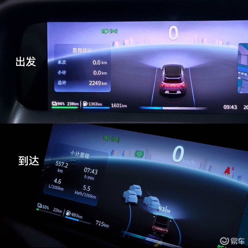 其中在郑州到六安段的节能挑战赛,《E汽车》记者所驾驶的车辆,总计行驶里程557.2km,耗时7小时43分,油耗4.6L/100km,电耗5.5kwh/100km。而这项成绩的前提是:全程因为雨雾天气影响,我们完全按照正常驾驶模式进行,并没有采取极端的节能驾驶操作。所以说,这台车完全可以消除我们的里程顾虑。