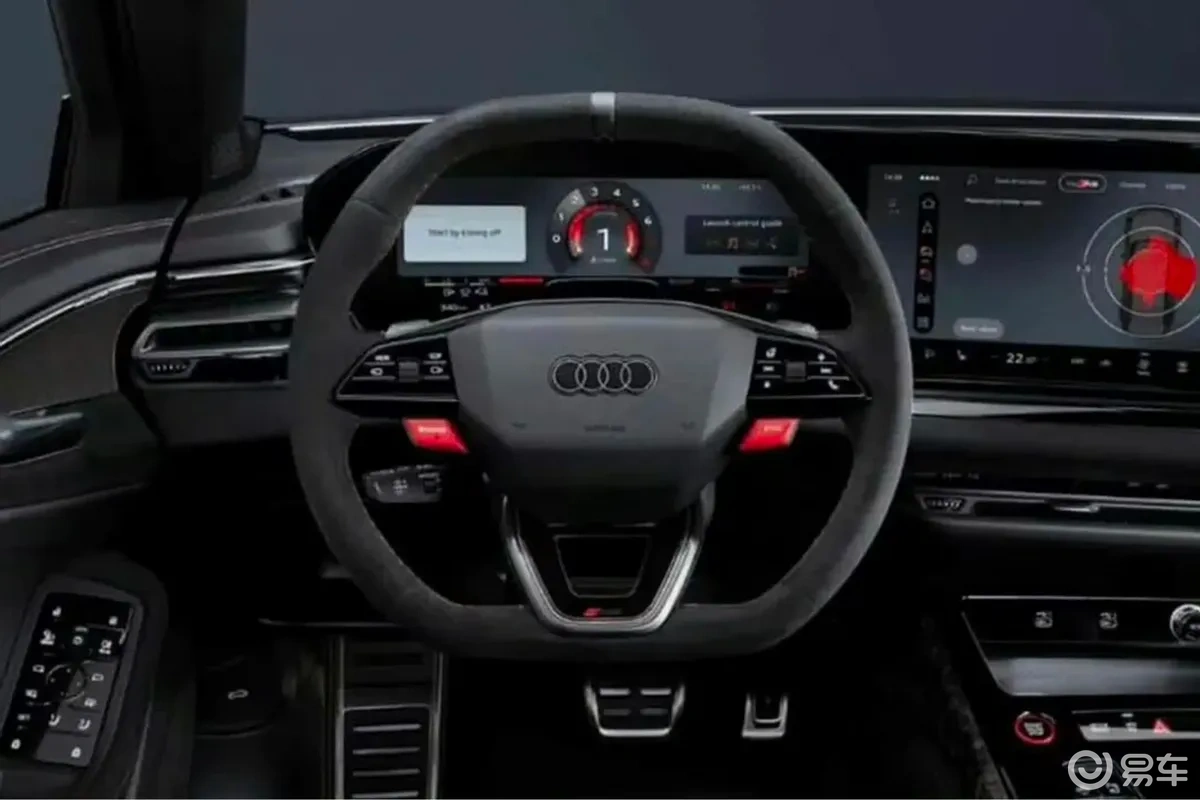 内饰延续奥迪RS家族的运动化基调,车内大面积使用Alcantara翻毛皮包覆,触感与运动氛围到位。方向盘为上下平底竞技造型,配有红色快捷功能按钮,大概率集成驾驶模式切换与启动功能。智能化配置方面,预计搭载11.9英寸全液晶仪表、14.5英寸中控屏与10.9英寸副驾屏的三联屏布局,依托PPC平台的E³ 1.2电子电气架构,车机响应速度、功能拓展性相比老款有明显提升,副驾屏还支持隐私模式,不干扰驾驶。