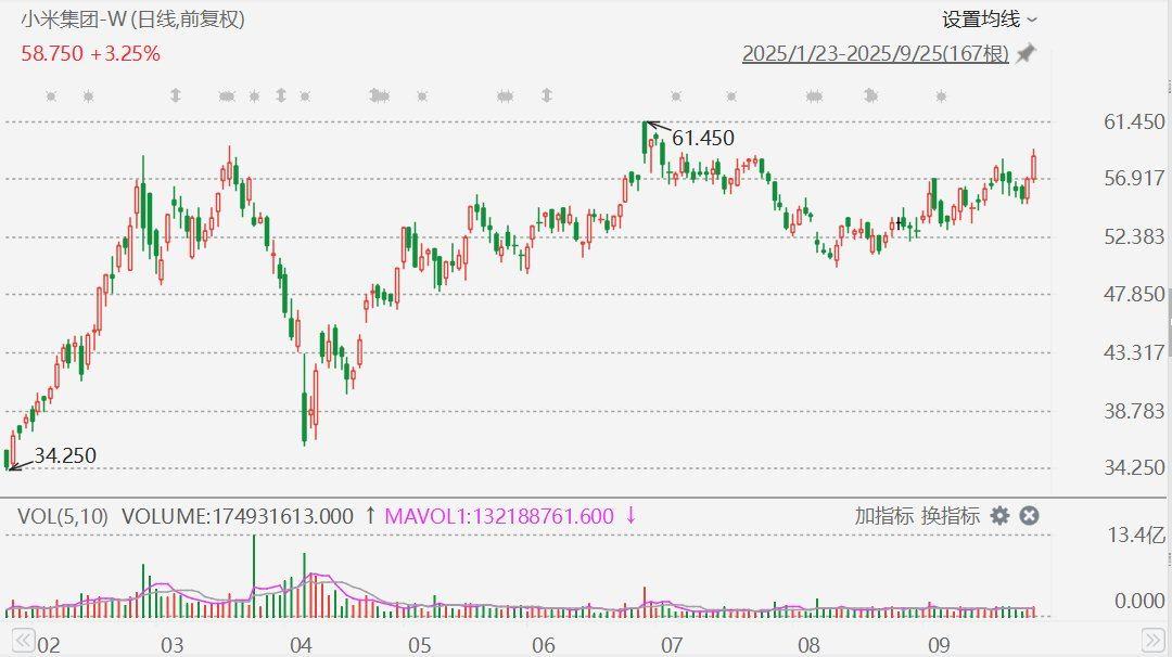 格隆汇9月25日|小米集团-W(1810.HK)盘中拉升涨4%,报59.2港元,股价创7月3日以来新高。