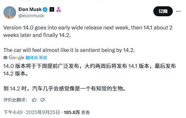 凤凰网科技讯 9月27日,特斯拉CEO埃隆・马斯克于近日通过其社交媒体平台X,公布了备受瞩目的FSD V14版本的详细推送计划。根据计划,特斯拉最快将于下周启动首个版本的部署,随后将依次推出V14.1和V14.2两个后续版本,以阶梯式更新的方式向用户交付这一重大升级。
