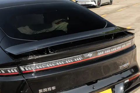 车尾设计饱满且富有层次感,贯穿式尾灯组采用 “天际晶格” 造型,内置 268 颗 LED 光源,点亮后如同璀璨星辰,视觉效果惊艳,夜间行驶时辨识度高,在车流中很容易被识别。电动尾翼可根据车速和场景模式自动升降,高速行驶时升起,增强车身稳定性,低速时收回,让车尾造型更简洁大方。下方黑色保险杠和隐藏式排气布局,进一步凸显了整车的运动感与科技感。