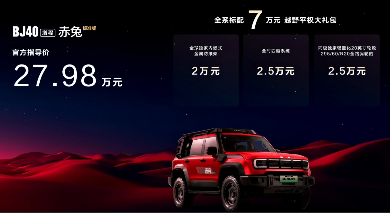 时隔几日,北京越野再度发布新车,日前北京越野正式宣布,2026款北京越野BJ40家族上市,其中燃油巨幕版车型综合焕新价13.29万起售、增程赤兔标准版27.98万元,同时增程悦野飞行版也同步开启预售,预售价为24.78万元。