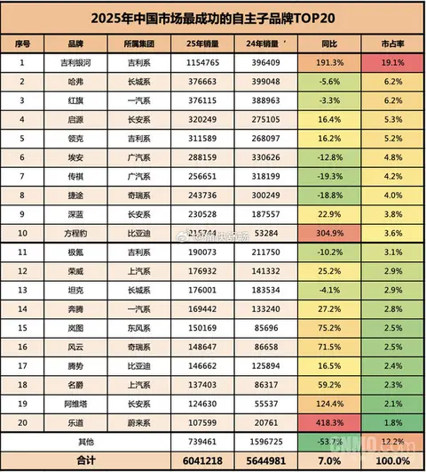 【CNMO科技消息】近日,汽车博主“痛快舒畅”发布了2025年中国市场“最成功”的自主子品牌TOP20。榜单前10的汽车品牌及销量情况具体如下: