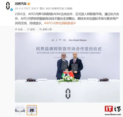 IT之家 2 月 26 日消息,赛力斯集团副总裁康波今日宣布,AITO 问界汽车在阿联酋斩获 200 台首批订单,实现中东市场开门红。