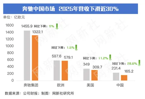 伴随销量下滑,中国区营收也成为拖累奔驰集团整体业绩的“重灾区”,财报显示,2025年奔驰集团总营收为1322亿欧元,同比下滑9%,欧洲,美国和中国,营收分别下滑1%,11%和29%,中国市场成为奔驰全球营收下滑最严重的单一市场。